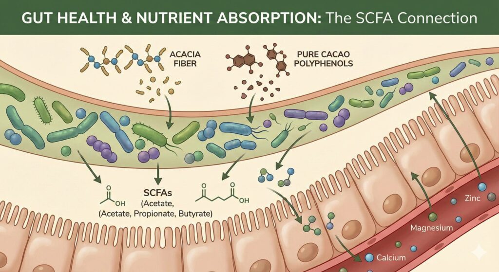 Short-chain fatty acids (SCFAs), such as butyrate, act as master regulators of gut health by lowering intestinal pH to increase mineral solubility and providing the energy necessary to maintain a strong, absorbent intestinal barrier. Supplementing with acacia fiber and pure cacao powder creates a powerful synergy: the acacia provides a slow-fermenting, gentle prebiotic fuel for beneficial bacteria across the entire colon, while the polyphenols and flavonoids in cacao act as selective fertilizers that boost SCFA production and suppress harmful microbes. Together, these elements transform the gut into a highly efficient environment, optimizing the bioavailability of essential vitamins and minerals while supporting long-term metabolic and digestive health.