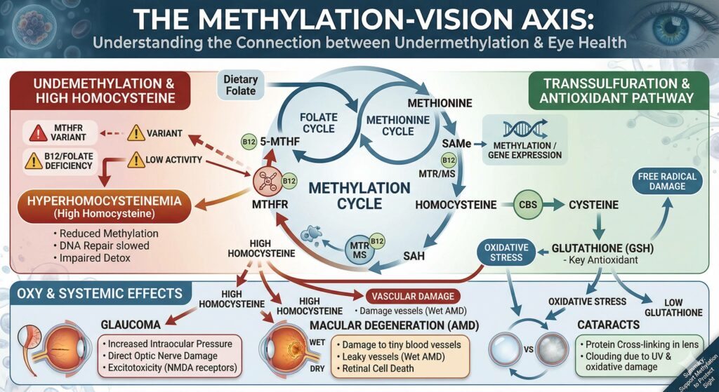The connection isn’t usually a straight line; rather, it’s a domino effect. When methylation is impaired, it often leads to high levels of homocysteine (a condition called hyperhomocysteinemia), which acts as a toxin to the delicate structures of the eye.