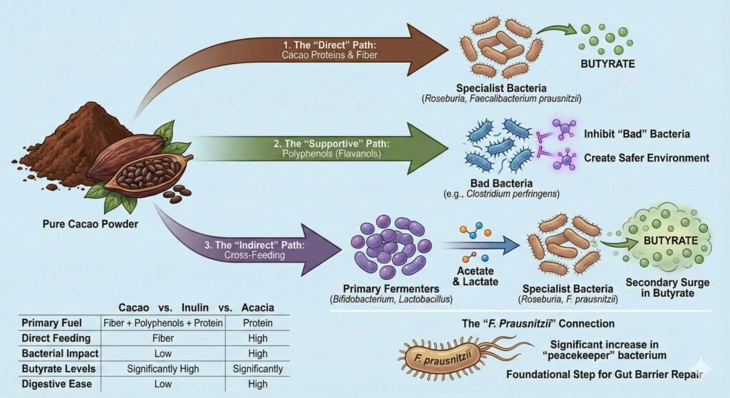 - Direct Action: Recent research (notably studies in 2025) suggests that these specific cacao proteins and insoluble fibers can be fermented directly by “specialist” bacteria like Roseburia and Faecalibacterium prausnitzii.