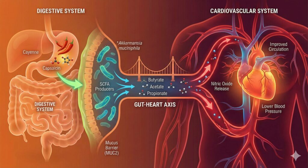 Cayenne pepper, through its active compound capsaicin, serves as a powerful dual-action tool for both heart and gut health by activating the TRPV1 receptor to trigger vasodilation and improve systemic blood flow. In the digestive tract, it acts as a unique “precision prebiotic” by stimulating the production of Mucin-2, which provides the essential fuel for the beneficial bacterium Akkermansia muciniphila to thrive. This microbial bloom, alongside the growth of other short-chain fatty acid (SCFA) producers, strengthens the gut barrier and prevents inflammatory toxins (LPS) from entering the bloodstream, effectively protecting the cardiovascular system from oxidative stress and arterial damage through the gut-heart axis.
